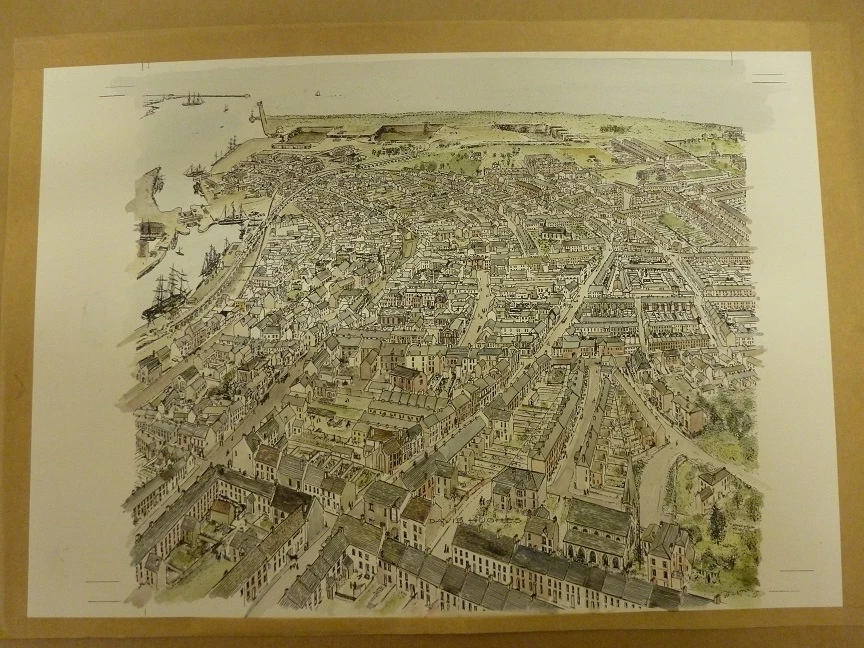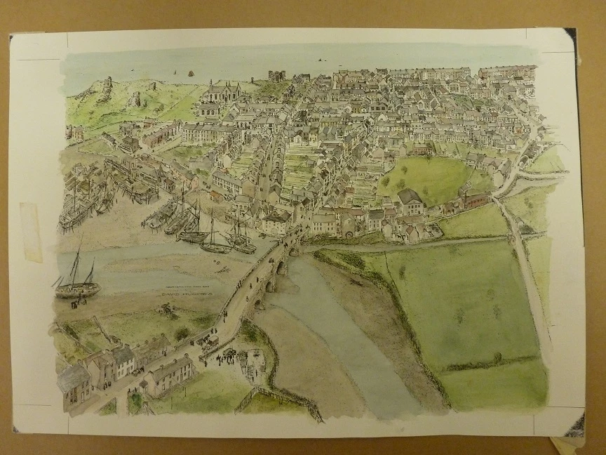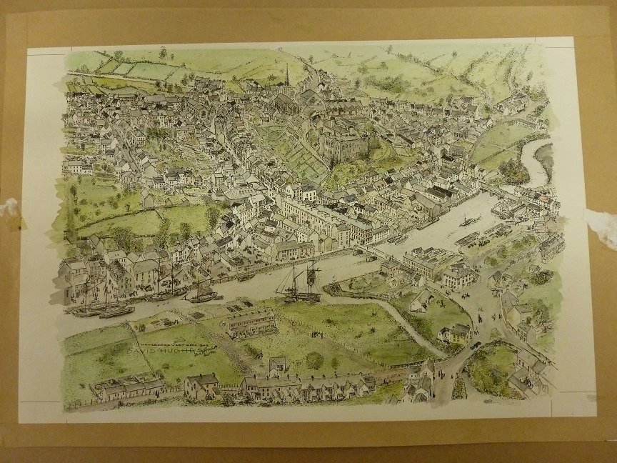 These three hand coloured prints form part of a collection donated this month. The prints are by the artist David Hughes and were produced in 1989/1990. The first is a reconstruction showing how Aberystwyth might have looked in about 1835. The second shows how Haverfordwest might have looked in about 1845. Finally the third shows how Swansea might have looked in about 1852.