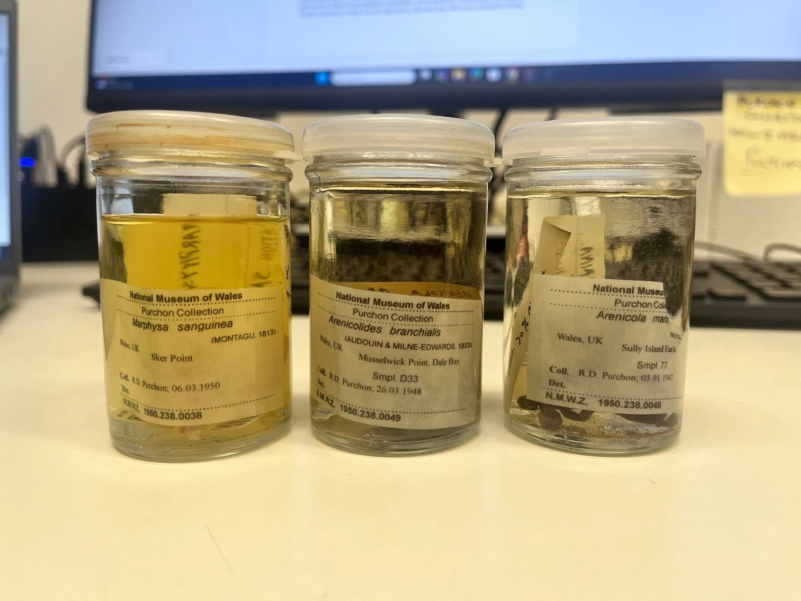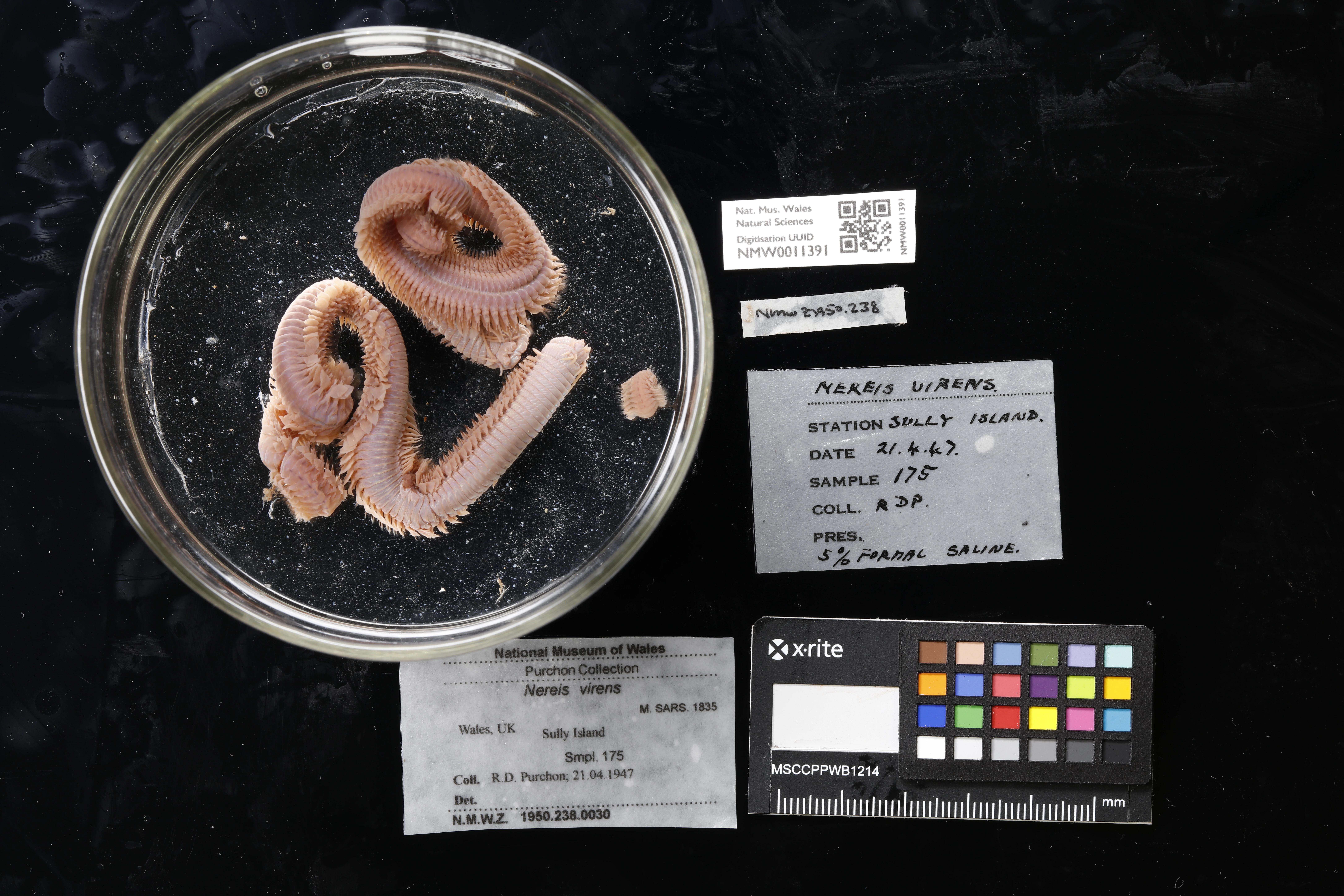 Felly, pan ddaeth cyfle yn Amgueddfa Genedlaethol Caerdydd i weithio gyda llyngyr gwrychog morol, aka polychaetes, roedd yn rhaid imi gyflwyno cais. Yn fy niwrnod cyntaf, osgoi mynd ar goll ar hyd llwybrau dryslyd coridorau’r amgueddfa oedd y brif dasg ac yna dechrau dysgu am y dulliau digideiddio y mae’r amgueddfa yn eu defnyddio ar gyfer sbesimenau. Dim ond ar ôl imi gael trefn ar bethau a dechrau gweithio gyda’r casgliad y sylweddolais pa mor anhygoel ydoedd mewn gwirionedd. Cafwyd y samplau gan R. D. Purchon o bum lleoliad ar hyd Môr Hafren: Llan-bedr Gwynllŵg, Ynys Sili, Harbwr y Barri, Breaksea Point, a Thwyni Dale. Mae hyn yn golygu bod pob sbesimen rwy'n ei drin wedi byw yn nyfroedd Cymru o amgylch Caerdydd! A finnau wedi teithio dramor ar gyfer fy ngwaith maes i gyd, roedd yn hawdd cael fy swyno gan farriffiau lliwgar a mamaliaid morol mawr. Ond mae'r casgliad hwn wedi agor fy llygaid i'r bylchau yn fy ngwybodaeth am rywogaethau rydw i’n rhannu fy nghartref â nhw ac sy’n rhoi cyfle i mi ddysgu mwy. Felly, erbyn hyn, pan fydd pobl yn gofyn i mi pam y symudais i Gymru, rwy’n gallu ateb "Pam lai?” Gyda’r holl fywyd gwyllt hardd, o balod i lyngyr gwrychog, mae cymaint i'w ddarganfod.