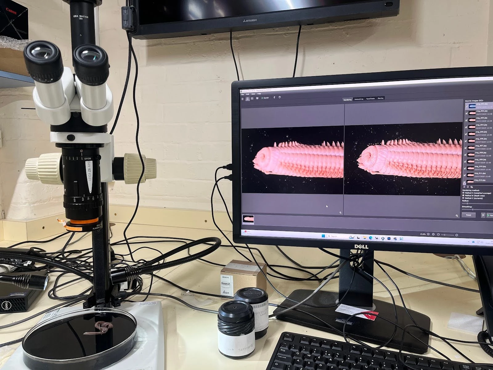 Cam cyntaf y broses ddelweddu yw cwblhau delwedd archwilio, sef tynnu llun o bopeth sy'n bresennol yn y jar (Ffigur 4). Gan ddefnyddio gefeiliau, byddem yn tynnu'r sbesimen allan a'i roi mewn dysgl petri llawn ethanol. Byddem wedyn yn cymryd yr holl labeli, hen a newydd, ac yn eu gosod yn daclus mewn ffrâm. Yna, byddem yn ychwanegu cod QR ar gyfer proses DISSCO. Ar ôl tynnu lluniau o du blaen a thu ôl y labeli a'r sbesimen, byddem wedyn yn symud ymlaen i'r delweddau o’r sbesimen. Mae Ffigur 5 yn dangos manylion y sbesimen, er enghraifft mae gan Arenicola marina nifer benodol o 'gylchoedd' ar ei ben a ddefnyddir i'w adnabod. Mae'r broses hon o ddelweddu sbesimenau yn golygu tynnu sawl llun ar lefelau ffocws gwahanol, sydd wedyn yn cael eu cyfuno i greu ffotograff hynod glir a manwl. Yna, rydyn ni'n defnyddio meddalwedd Helicon Focus i rendro'r ddelwedd derfynol hon cyn ei throsglwyddo i Photoshop i ychwanegu bar graddfa. Cwblhawyd y broses hon ar gyfer fy nghasgliadau i a Mayu (Ffigur 5). Byddem yn cyfnewid tasgau’n rheolaidd, gan roi cyfle i ni feithrin ein sgiliau delweddu ymhellach (Ffigur 6). Ein tasg olaf yn ystod ein hamser yn yr amgueddfa oedd defnyddio Photoshop i olygu ein delweddau i'w gwneud yn lân ac yn daclus.