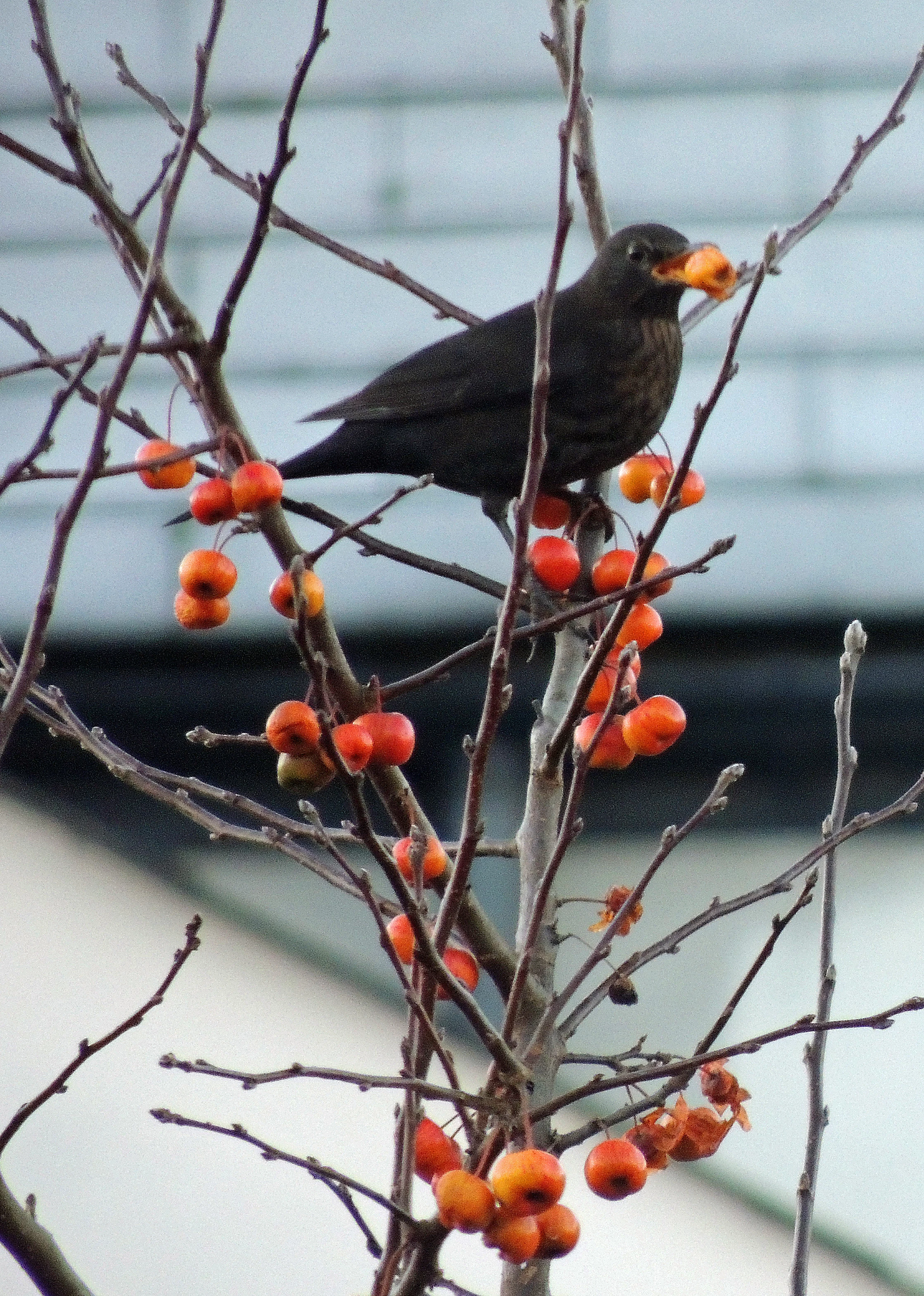 Ar yr adeg hon o'r flwyddyn, mae’r adar yn llwglyd iawn ac yn dechrau bwydo ar aeron. Dechreuodd yr aderyn du yma bwyta'r afalau surion oddi wrth y goeden ar waelod fy ngardd. Nid wyf yn torri llawr y goeden fel ei fod yn ffynhonnell dda o fwyd i'r adar yn y gaeaf. Mae hwn yn aderyn du benywaidd - maent yn frown ac nid oes ganddynt bigau melyn.