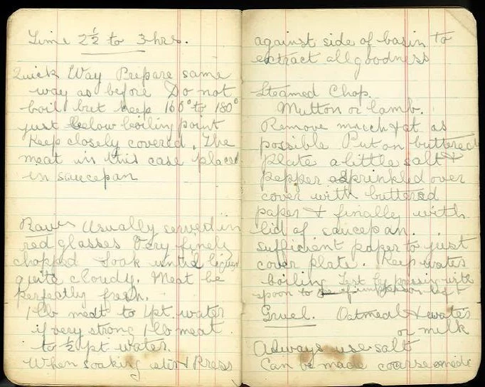 fan hyna oedd yn eiddo i Phryswith Matthews – merch saer olwynion pentre Sain Ffagan. Mae’r llyfryn yn llawn ryseitiau, gan gynnwys prydau bwyd addas i gleifion. Bu Phryswith mewn darlith ar ‘invalid cookery’ ar 6 Ionawr 1914 – mae’i nodiadau o’r ddarlith honno yn y llyfryn. Yn ystod y Rhyfel Mawr, roedd hi’n gweithio fel nyrs VAD yn Ysbyty’r Groes Goch ar dir Castell Sain Ffagan. Gallwch weld rhagor o wrthrychau a lluniau sy’n gysylltiedig â stori'r ysbyty ar ein gwefan.