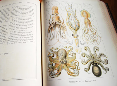 Our copy of Kunstformen der Natur [photographed here] is a complete bound volume of all ten fascicules and sits in our folio section. It was donated to us in 1919 by the first Director of the National Museum of Wales [from 1909 to 1924], William Evans Hoyle. Hoyle’s trained as a medical anatomist and developed a life long interest in 'cephalopods'. Our BioSyB Department now holds Hoyle's cephalopod collection [over 400 of them] along with many other specimens and publications.