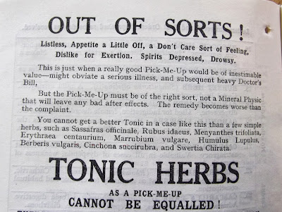 What exactly went into the herbal remedies is one mystery now most likely beyond solving [many of the ingredients are listed but not all] but it is the naive and whimsical wording of the ailments themselves that are so interesting to us now [Remedies for weak men and nervous women, Poverty of nerve force and That don't care sort of feeling spring to mind] and this naivity is illustrated further with the Disney-like wizard and his bubbling cauldron on the cover.