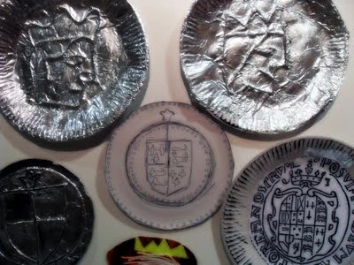 Rydyn ni wedi bod yn lliwio ac addurno ceiniogau Tuduraidd yn y cert celf ac wedi bod yn defnyddio cortyn a ffoil i wneud arian 3D.