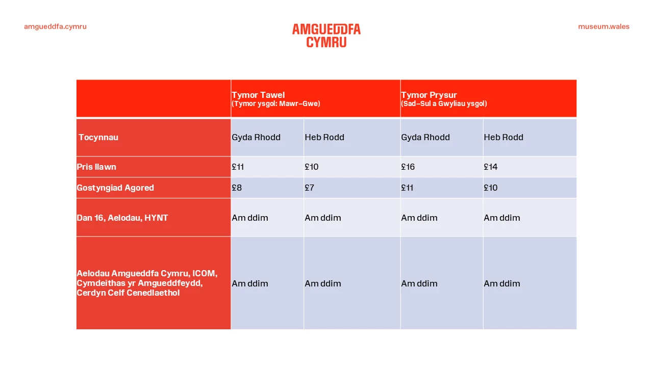 Wrth brynu tocyn gallwch chi hefyd wneud rhodd bychan dewisol. Gall rhodd bach wneud gwahaniaeth mawr, a'n helpu i ofalu am y casgliad cenedlaethol, creu arddangosfeydd sy'n ysbrydoli a pharhau i adrodd straeon pwysig. Bydd rhodd bychan o 10% o bris y tocyn yn golygu y gallwn ni hawlio Cymorth Rhodd ar bris llawn y tocyn. Fel elusen, mae eich cefnogaeth chi yn gwneud gwahaniaeth gwirioneddol. Diolch.