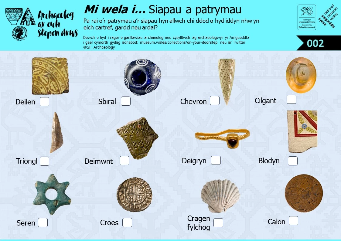 Mae ein taflenni 'Mi wela i...' wedi'u hysbrydoli gan rai o'r gwrthrychau archaeoleg anhygoel yn ein casgliad. Mae 12 eitem ar bob taflen - allwch chi ddod o hyd i bob un?