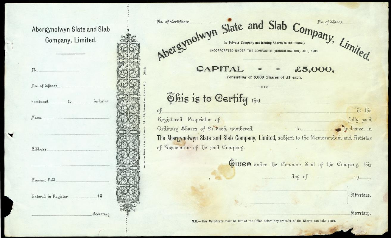Abergynolwyn Slate and Slab Co. Ltd., share cert.