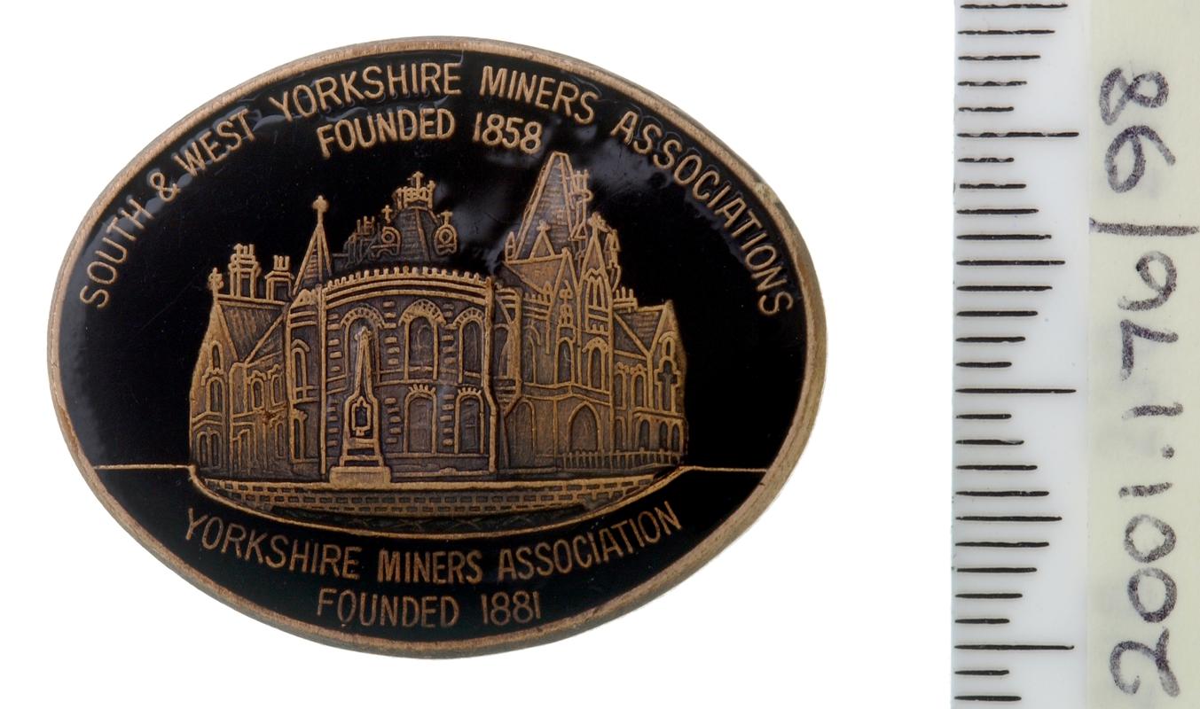 Oval gold coloured metal badge with building design and inscription. Clasp attachment on reverse.