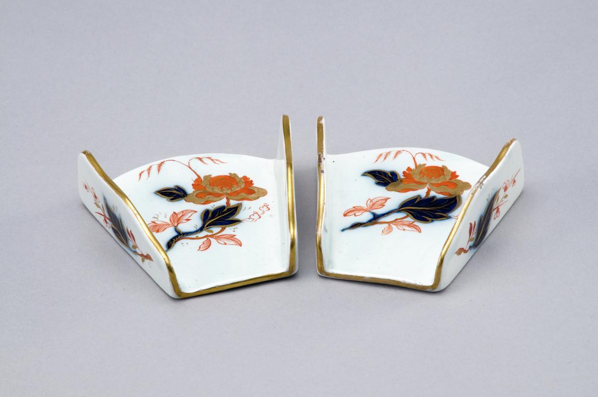 Teapot and cover, hard-paste porcelain, standing on a foot rim, balaster shaped body, scroll handle, moulded up-turned spout, domed cover with pagoda shaped finial; decorated in iron-red enamel, with a continuous landscape, one side with two classical columns and a figure leant over a stick, opposite two figures under an umbrella and two figures, one seated, one standing leaning on a stick, one figure bent over by a monument, gilding to foot rim, ornamental gilt border to shoulders and around spout, gilt band on handle and spout, iron-red scrolling to handle, iron-red flowers to spout, cover decorated with panoramic landscape, a figure leaning on a stick, figure seated on a bench with basket (facing away), another standing next to her, gilt band to rim.