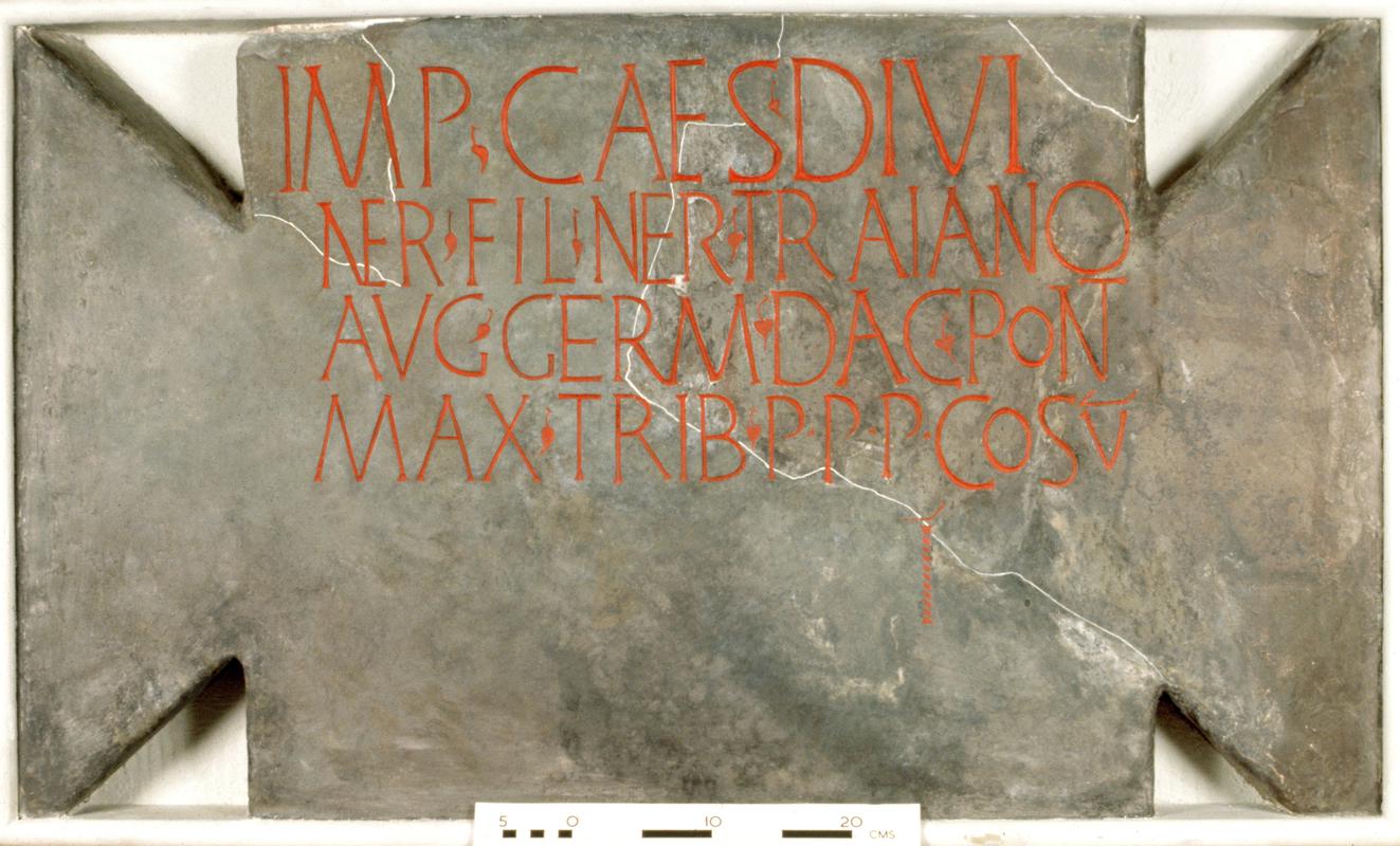 A slightly tapering block of stone inscribed:- coh(ortis) I | c(enturia) Statori | M[a]ximi | p(assus) X[X]Xlll s(emis)