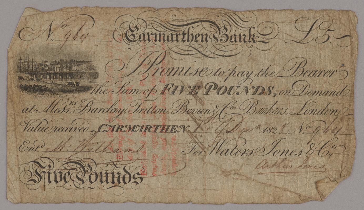 'Carmarthen Bank' five pounds bank note. Numbered 149. Signed for Waters, Jones & Co. and dated 23 August 1830.