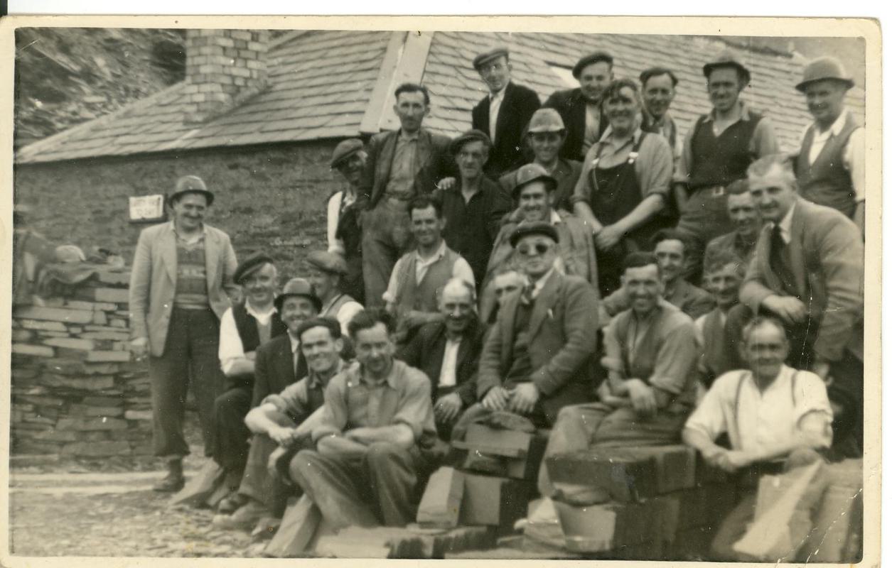 Black and white photograph, printed on postcard, of a group of 12 quarrymen at Dinorwig Quarry. The quarrymen are standing outside one of the gwaliau (open ended shed). It is believed that the quarrymen photographed lived in the Nant Peris area as the donor’s family were from Nant Peris.