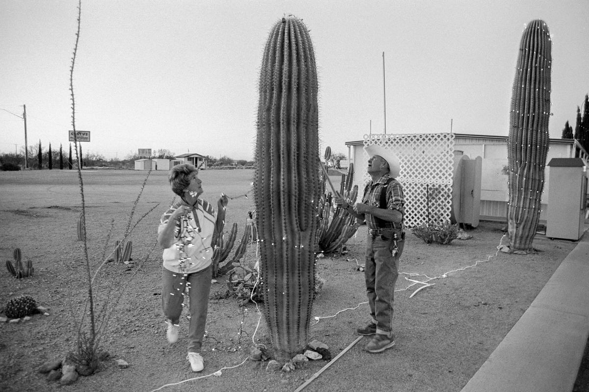 Phoenix Park. Grandad and grandson fishing. Arizona USA