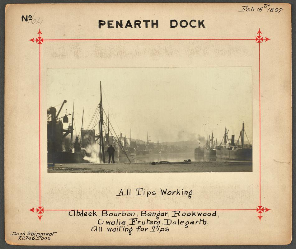 View of two steamers, ZEUS and BENEFACTOR, waiting for tips at Penarth Dock (a different view from 1993.86/6), also shows ships PRIMROSE and CASTLETON. Black and white photograph mounted on cream card with red decorative border.