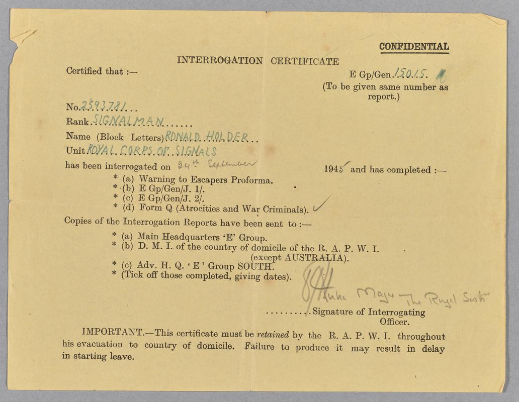 Part of a collection of items belonging to Cecil (Joe) Rees. Cecil (Joe) Rees was a member of the RAF and took part in several bombing raids during the Second World War. His plane was shot down in May 1943 on the way back from a raid on Wuppertal, Germany. While sheltering with a Flemish family, Cecil was captured by the Germans and sent to the prisoner of war camp, Stalag Luft 3. However he managed to escape but was recaptured by the Germans and sent back to the camp.