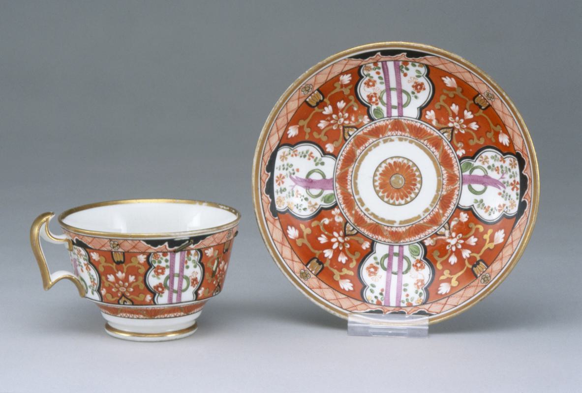 Saucer, bone china, rounded foot rim, cushion-moulded profile, plain rim; pattern of scattered abstract flower motifs and a band of stylised leaves round the well printed in pink under the glaze, a plain gilded band round the rim.
