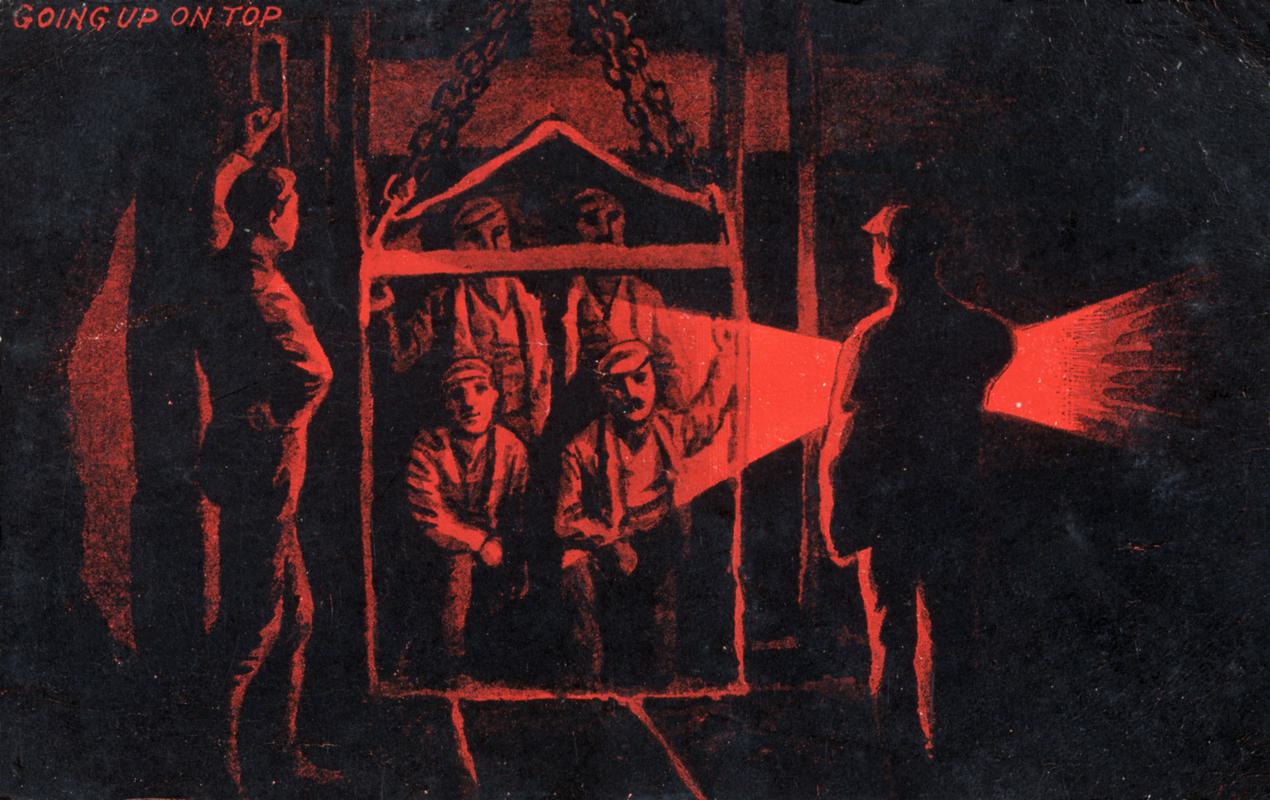 Postcard from The Colliery Series No. 1. Dark blue and black drawing of a South Wales colliery. Bilingual print on reverse. Unused.