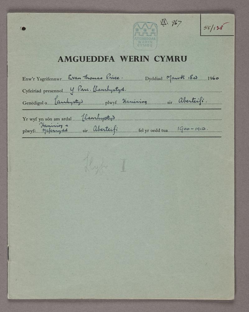 Llyfr Ateb Amgueddfa Werin Cymru, 1959, oddi wrth E.T. Price, Llanrhystud, yn cynnwys nodiadau manwl ar Ffair Rhystud adeg Calangeuaf a Ffair geffylau Llanrhystud.