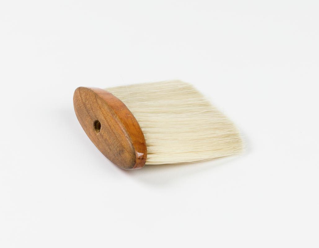 barber's portable neck rest presumably used to adjust position of client's head at a basin or during shaving; narrow block of varnished wood; flat base with cork layer for grip; curved trough-like top to fit neck shape; covered in brown leather; two holes at either end of block of wood for threading of rope to hold rest in place; one piece of rope still in place