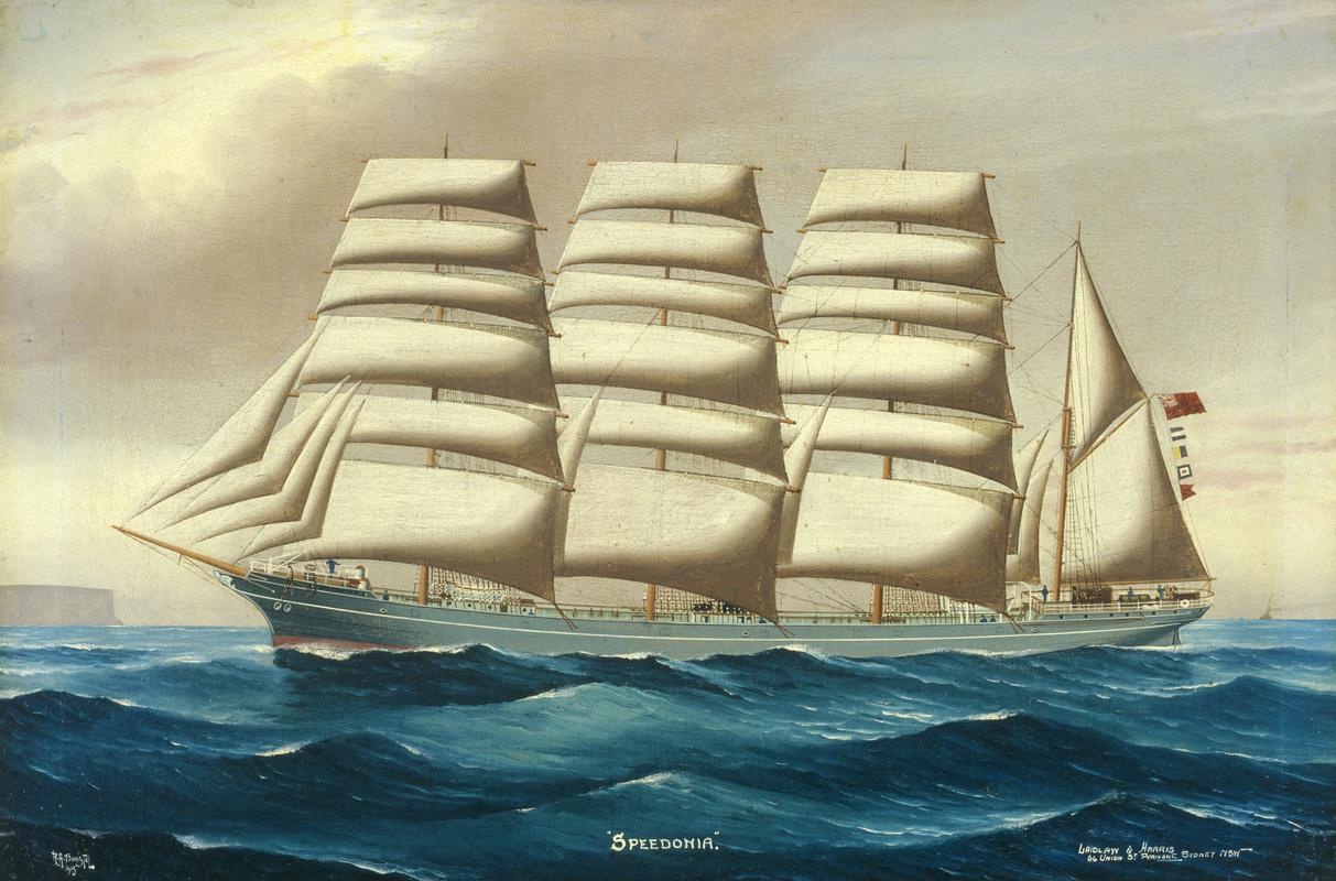 Golwg o ochr dde'r cwch pedwar mast LYNTON ar y môr.