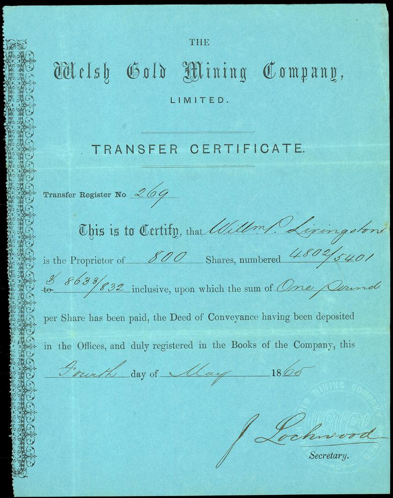St. David Freehold Gold Mining Company, £5 ordinary shares, 1865, black on white. * Black print on white paper with handwritten details completed in black ink. Ornate border at left only. Embossed share broker seal on upper right hand corner. Five £5 shares numbered 275 to 279. Certificate number '60'. Dated 23 March 1865.