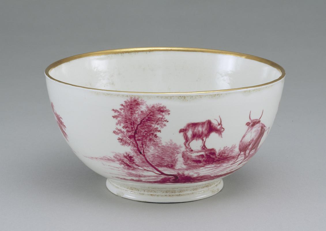Slop-bowl, hard-paste porcelain, standing on a shallow footring, rounded sides tapering inwards at base; painted in polychrome enamels, on one side with a large exotic fowl in red, blue, yellow, brown and puce walking in a landscape, flanked by two other brightly painted birds, a branch to right, and another to left with a large puce blossom, inhabited by two smaller birds, spray of foliage opposite, gilt border line to lip, interior painted with a small device, similar to an ermine tail, in olive green.