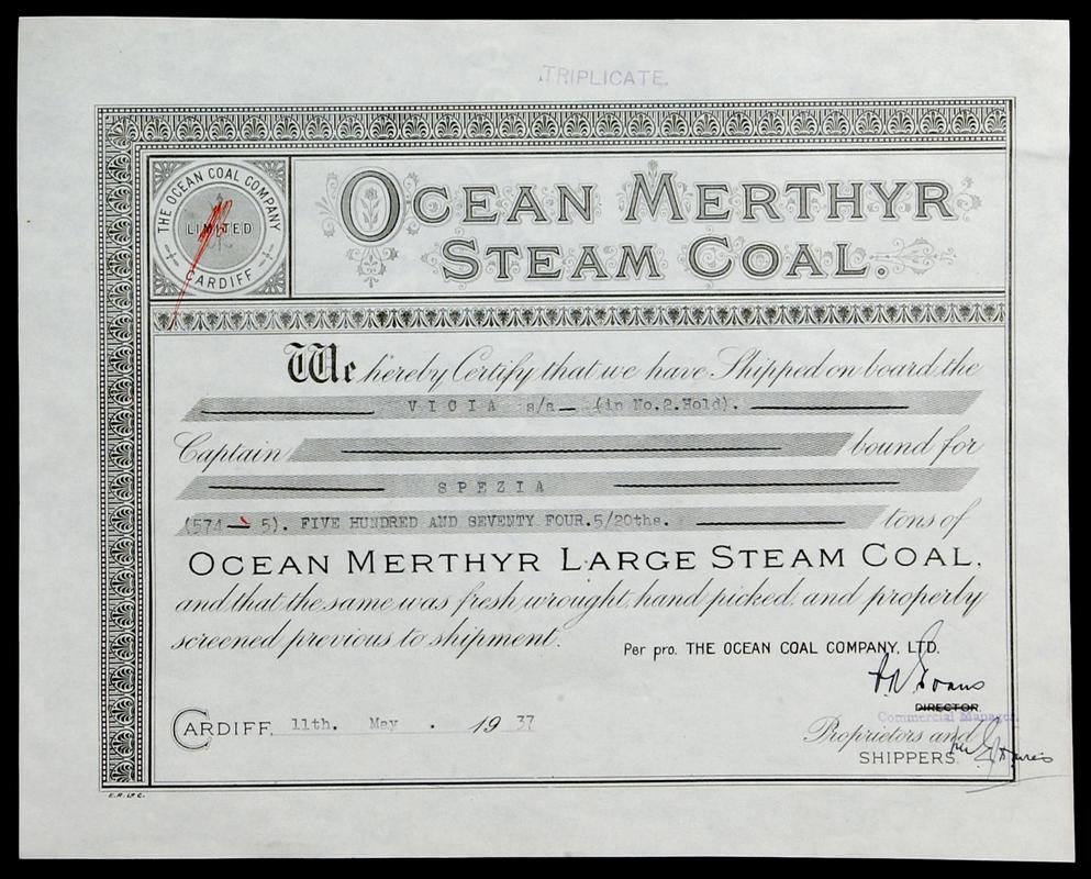 Ocean Merthyr Steam Coal Co.Ltd., lading certificate