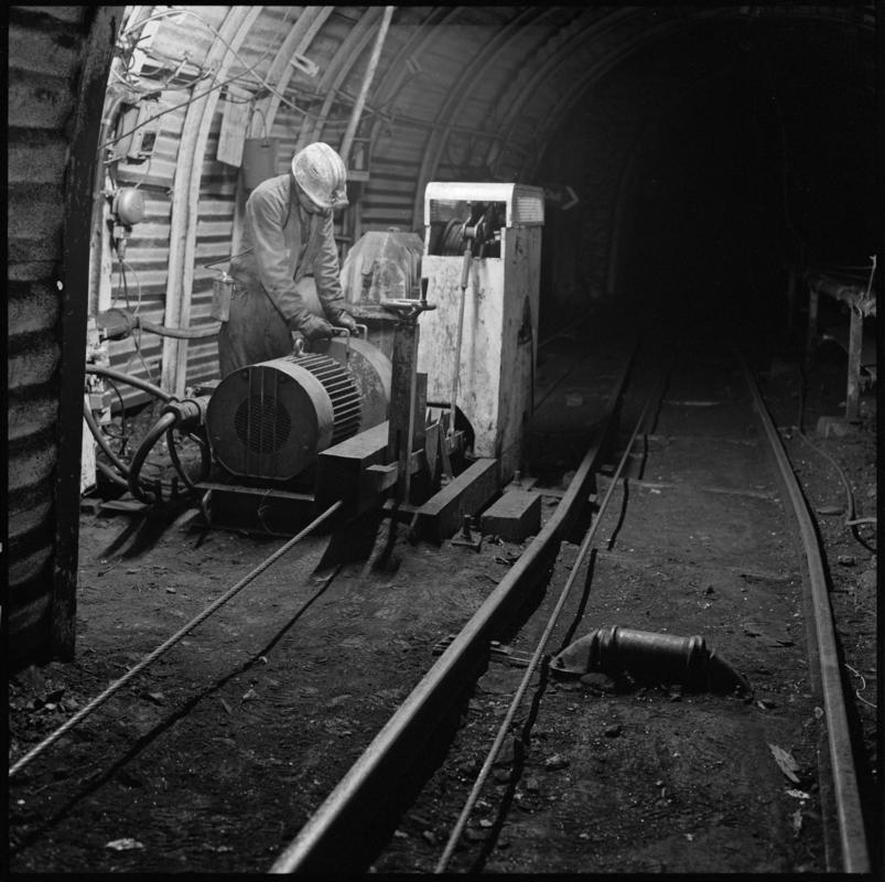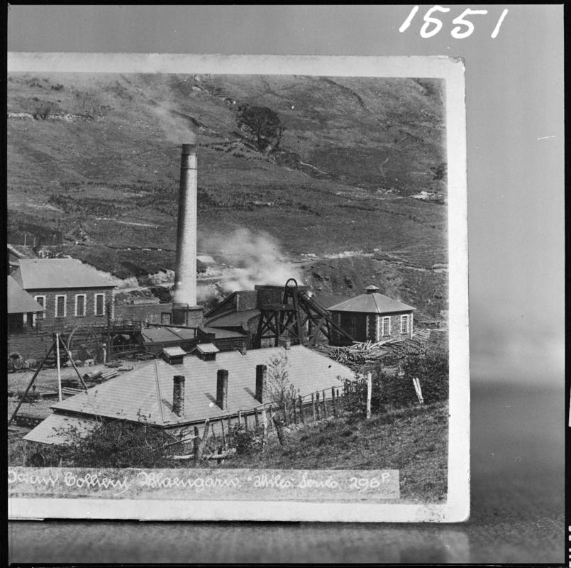 Negatif ffilm lliw yn dangos llafnwr Anderson Strathclyde ar gludydd di-gadwyn ffas, Glofa Nantgarw.
