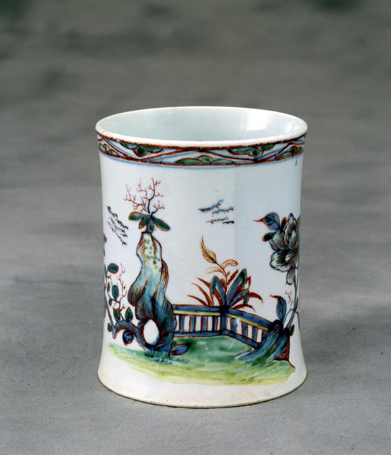 Mug, earthenware, rounded spreading foot-rim moulded with anthemions, cylindrical body with a number of regularly-spaced shallow incised lines running down it, lip-rim moulded with anthemions, scrolled loop handle with a raised foliate moulded thumb-spur; transfer-printed in black with to the exterior sides of the body two different rural scenes showing figures by the side of a river with trees and buildings in the background, black bands to the exterior and interior lip-rim, black anthemions and further black markings to the handle, a brownish tinge to the glaze, a large chip to one side of the lip-rim from which a crack spreads down the side of the body.
