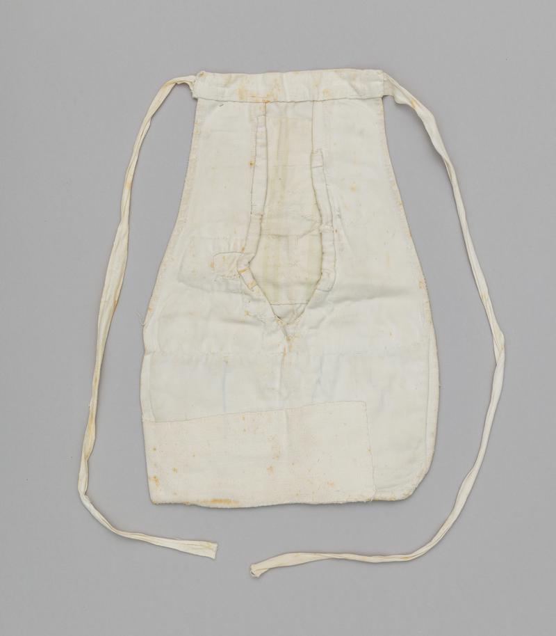 Cream silk apron, early 18th century. Gathered into a narrow waistband. Large scalloped edges embroidered with silver thread, and floral motifs embroidered in pink silk and silver thread. From Plas Llanfair, Llanfair-is-gaer.