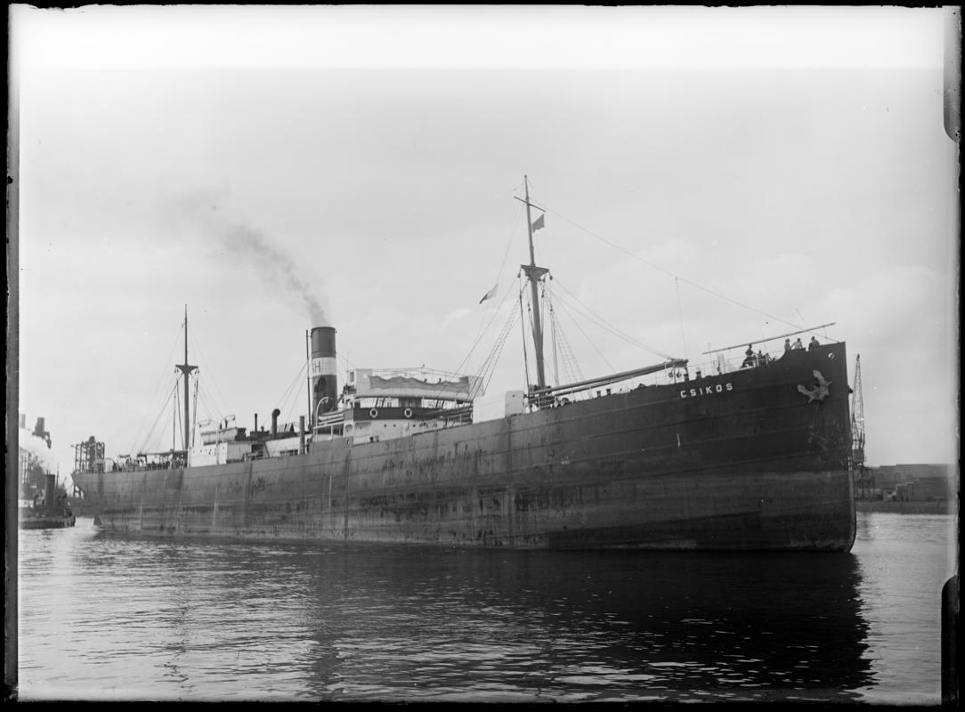 The SS Trevince was the fiftieth vessel completed by John Readhead and Sons of South Shields for the well-known Hain Steamship Co of St Ives, Cornwall. These ships were well-known in Cardiff, and it was the company’s proud boast that there was never a time when the distinctive white ‘H’ funnel mark could not be seen in the Bristol Channel. Completed in 1907, the SS Trevince was sold to Greek owners in 1926, and was wrecked on the Portugese coast in June 1932.