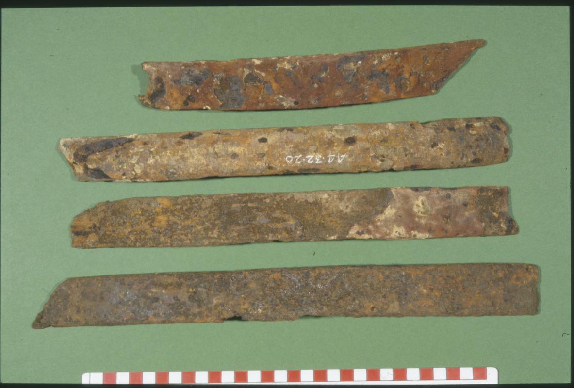 Nodiadau: Found during the construction of an airfield at RAF Station Valley. Some certainly, the rest probably, from a wet meadow which formed the margin of Llyn Cerrig Bach. The exact depth below the grassy surface at which the objects were deposited is not known. The bog was excavated to a maximum depth of 20 feet. A few objects were found on the spot, after the peaty deposit had been won from the boggy margin of the lake. The rest, with the exception of 44.32/58, were found on that portion of the adjacent aerodrome on which the peat from this site had been spread. Animal bones were associated with the deposit and many metal objects were stained with vivianite.