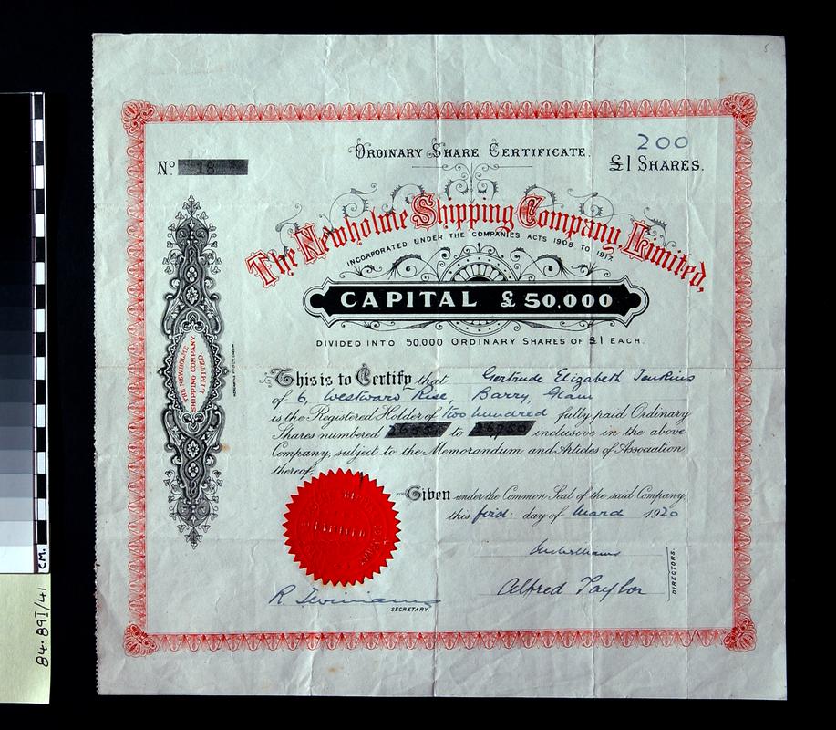 Llewellyn Shipping Company Limited, £1 ordinary shares, 1919, black on white. * Black print on white paper with handwritten details completed in black ink. Ornate border on left only. Embossed company seal depicting embossed company flag on lower left hand corner. 100 £1 shares numbered 131892 to 131991. Certificate number '275'. Dated 2 October 1919.