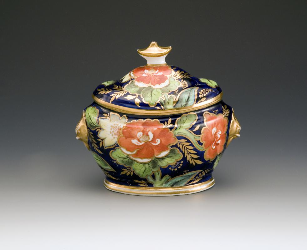 Muffin dish and cover, greyish-blue hard-paste porcelain with a slight brownish translucency, circular dish standing on a shallow foot rim, bowl-shaped with sides curving to a plain everted rim, shallow domed cover with a collared bead knop; both dish and cover are decorated with an underglaze blue ground reserved with two red peonies and with a red and yellow flower amid realistically painted foliage, the edges lined in gold, and with gilt sprays of leaves, narrow gilt band at rims, upper part of knop only is gilded.