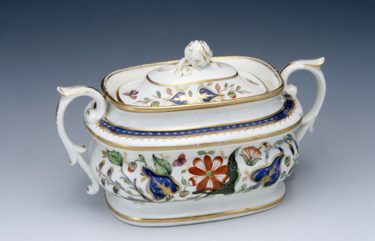 Teapot with cover, soft-paste porcelain, circular, etruscan shape that widens into a flattened collar toward the rim, loop handle with thumb rest, curved spout, small domed cover with conical finial, footring: the rim edge of the cover and teapot; middle of the teapot; and the collar edge of the teapot are decorated with gilt line borders, the collar is decorated with a continuous border of gold leaves, both pieces are banded with pink roseheads on beds of gilt moss, the cover at the base of the finial is banded with a gilt line and gold leaf border, the spout edges are gilded and the spout and the handle are decorated with leaf and flower sprigs in gold.