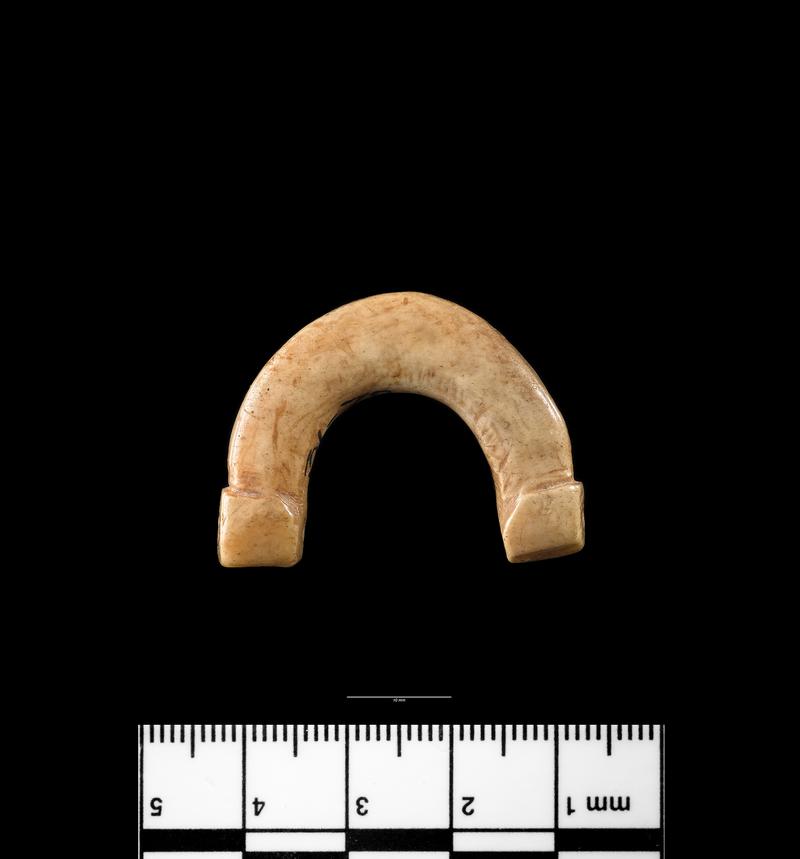 Turned bone handle (?) broken. Decorated with a few simple grooves at either end and also at the centre. Possibly made from a pig's femur.