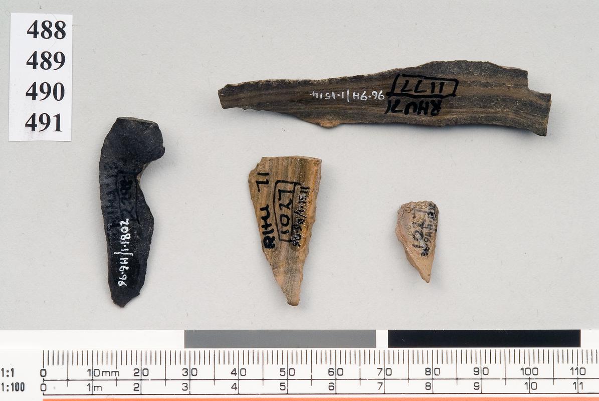 Manufactured from a sheep metapodial. The shaft has been cut at a very oblique angle and more of the medullary cannal is exposed than is normal on these forms. A perforation has been made just below the distal epiphysis which has not been removed