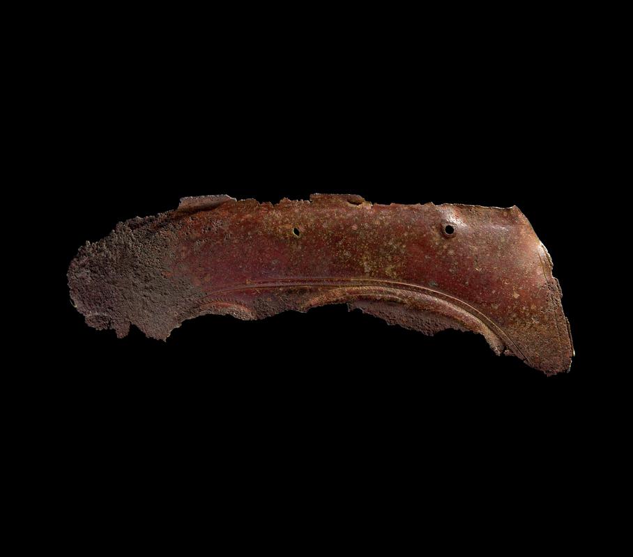 Badly corroded (much more so than the one under 63.419/5) pelta-shaped plaque for the ornamentation of a shield (probably the same shield from which the shield boss fragments under 63.419/1 & 2 derive) which, together with plaque 63.419/5, was cut from a disc 420mm in diameter. Very faint traces of decoration in the same style as the /5 plaque.