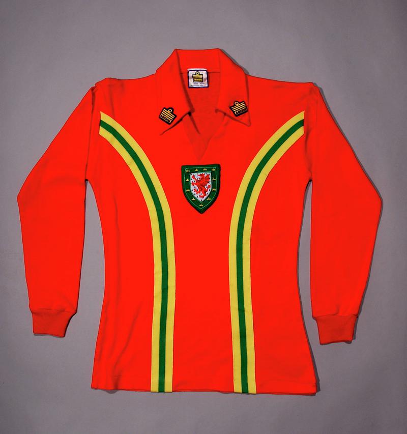 Red adidas football shirt, short-sleeved, unworn, with orange adidas stripes across shoulders, crest woven badge machine-stitched to left chest, 'adidas' logo machine-embroidered in orange on right chest. V-neck with 4cm wide red jersey binding. Complex Jersey-knit construction with a narrow stripe effect. Cuffs finished with 5cm wide section of heavier-knit fabric bearing orange, red, green and white stripes. Below the neck, at centre back, there is a Ø 22mm self adhesive, circular sticker, which is red with gold edge and gold print with the FAW motto 'GORAU CHWARAE CYD CHWARAE', with the yellow daffodil in the centre (six petals). The daffodil has a black centre. On the front of the lower proper left corner, there is an upside-down inscription of black, adhered capital letters: 'AEROREADY'. The front of the shirt bears 24 hand-written signatures of the team's players in black marker pen. Printed inscription at inner centre back neck in dark grey: adidas label, Size S, AEROREADY, MADE IN CAMBODIA. The shirt's lower hem has a 2cm wide single turn back secured with a double-line of machine stitches using red synthetic thread. Side seams are finished with overlocking stitches. Yellow stripes at shoulder are machine stitched with yellow stitches. Cuffs are stitched with both yellow and red thread. Shoulder seams are hidden underneath front-most yellow stripe. Four labels printed in black on white synthetic woven fabric held in lower left side seam, with care instructions, country of manufacture, and composition (all in 28 languages). Additional label printed with bar codes and numbers attached to inner left neck. Shirt is made from 100% recycled Polyester. AEROREADY means the fabric has special moisture absorbing qualities.