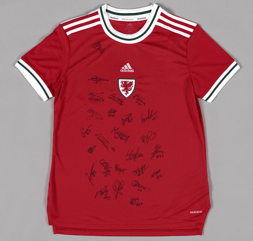 The players who would have signed the shirt are (though the signatures are largely illegible): Goal keepers: Wayne Hennessey, Adam Davies, Tom King. Defenders: Chris Gunter, Ashley Williams, Ben Davies, Connor Roberts, Tom Lockyer, Chris Mepham, James Lawrence. Midfielders: Aaron Ramsey, Joe Allen, Harry Wilson, Ethan Ampadu, Daniel James, Joe Morrell, Will Vaulks, Dylan Levitt. Forwards: Gareth Bale, Sam Vokes, Tyler Roberts, Kieffer Moore and Rabbi Matondo.