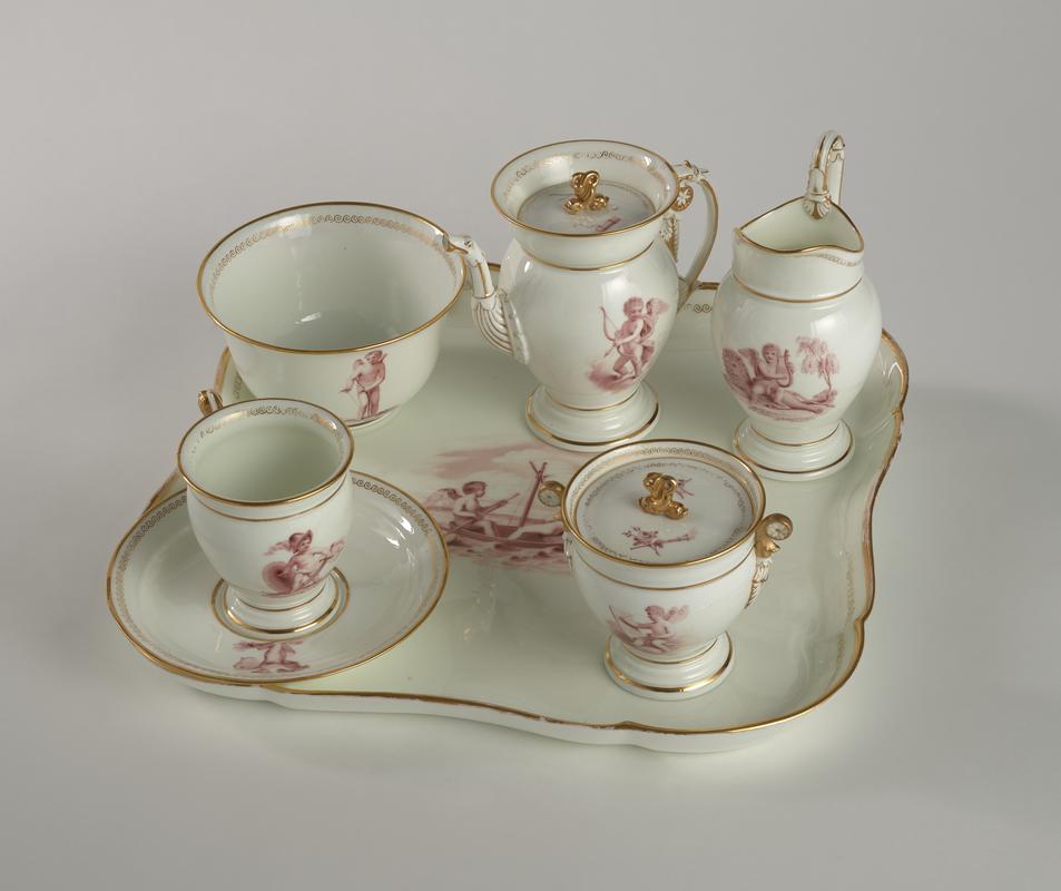 Tray, from a cabaret service, soft-paste 'duck egg' porcelain, with a blue-green translucency; standing on a flat unglazed foot, square shaped with rounded corners between concave sides, and a grooved gallery; painted around the edge with diagonal rows of three pink roses alternating with three gilt c-scrolls and red berries, all below a gilt c-scroll border, and a bouquet of three pink roses in the centre; gilt scalloped edge to lip.