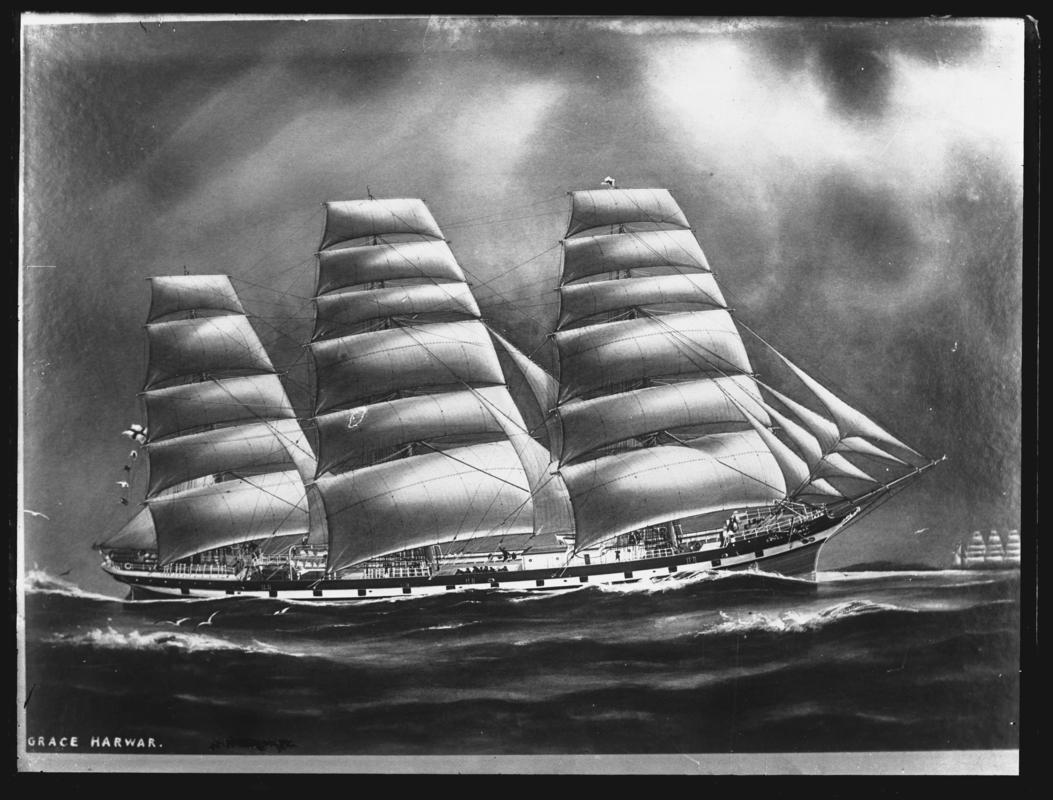 Photograph of a painting by the Australian marine artist R.A. Borstel showing a port broadside view of the three-masted ship ARTENSIS