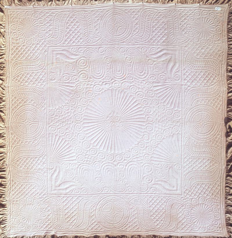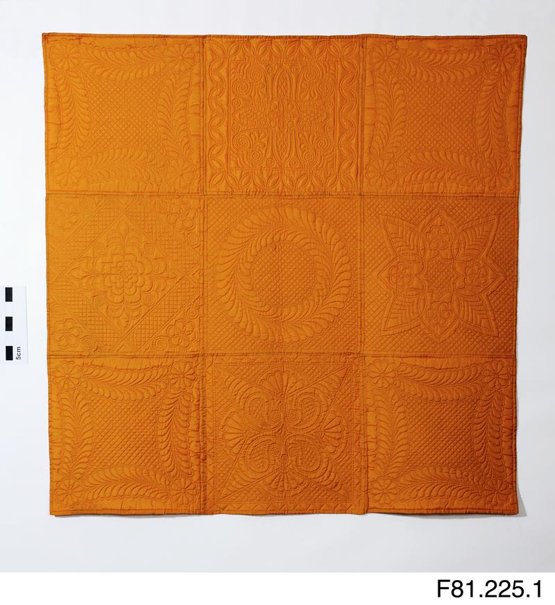 Quilt covered with Paisley patterned printed shawls. Fillled with a blanket. Simple quilting of spirals with star in centre. Made in 1917 by Mrs Ann Miles at Penbwch Isaf Farm, Pontypridd.