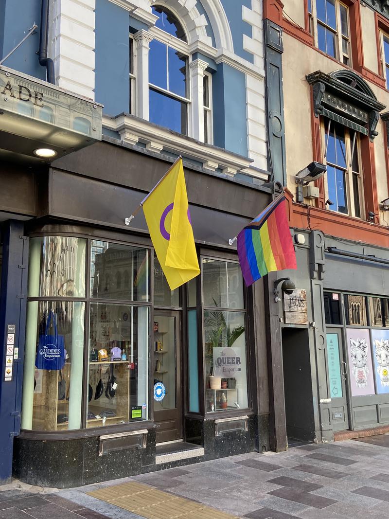 Flags flying ouside The Queer Emporium, 14 June 2021. The Queer Emporium opened in the Royal Arcade, Cardiff, in June 2021 as a pop up for Pride Month. It is believed to be the first Queer Emporium in the UK, and possibly the world. It features fifteen LGBTQ+ independent businesses, encouraging the LGBTQ+ community to shop queer during Pride Month.