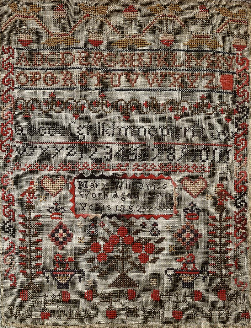 LINEN CANVAS, unbleached, embroidered with coloured wools in cross stitch. Various detached designs: conventional flowers and flowering plants, some in pots and vases, lions, stags, birds and crowns, those in the lower half being symmetrically arranged. At the bottom is the inscription: "The rose is a flower that fadeth away bu (sic) / a virtuous woman will never decay / Jane Miles Aged 9 yers (sic) 1843". There is a border of a wavy stem with strawberries. Made by donor's mother at Caerphilly, Glamorganshire.