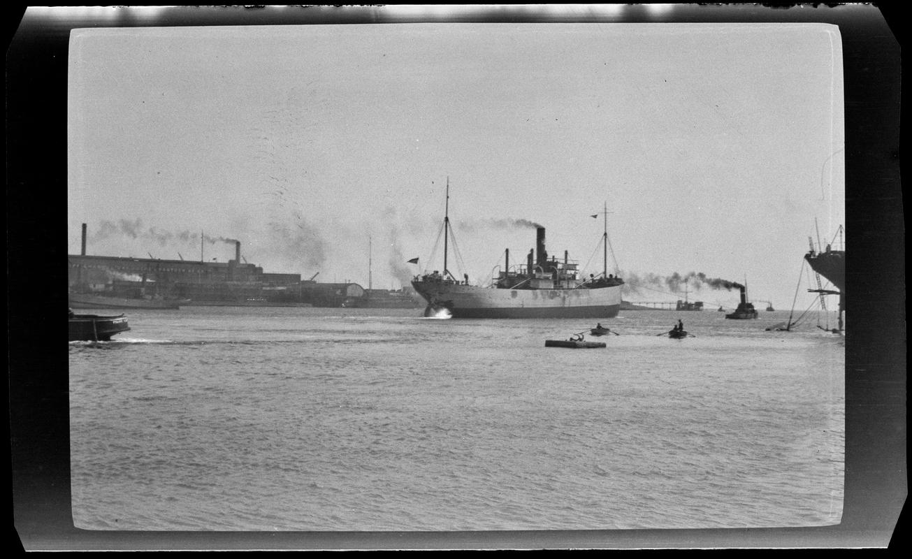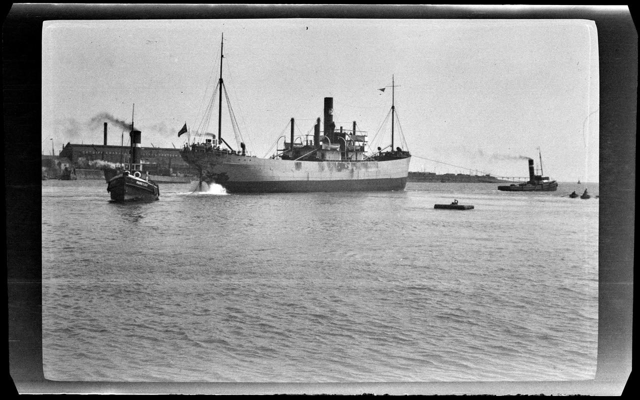 Sailing vessel and tug at Cardiff Docks. The Pierhead building can be seen in the distance.