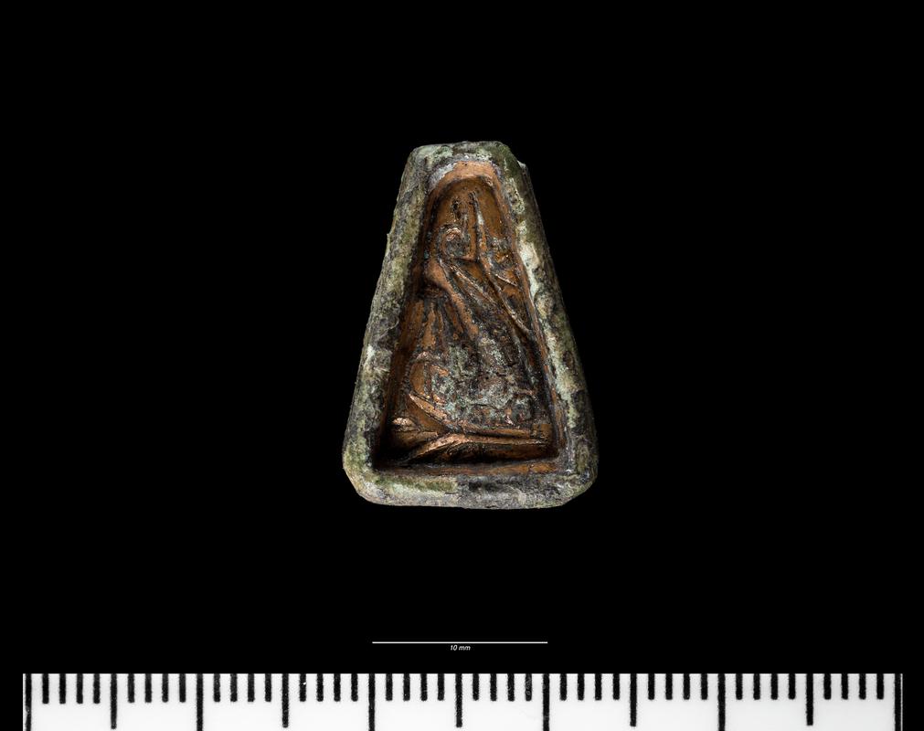 A pierced frame or fitting made from copper allow. It is a curved strip with irregular perforations along its length. The majority of the perforations overlap the edge of the strip rendering some of the perforations semi-circles, some nearly complete and two completely round remaining within the bounds of the metal strip. The perforations occur at irregular intervals and vary slightly in size. The irregularity indicates this is a hand made item and the context suggests it is from the medieval period. Each end has a broken perforation that may correspond to its opposite perforation, hinting that this may have originally been a complete ring.