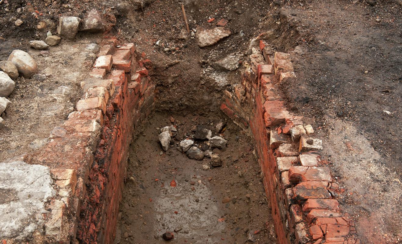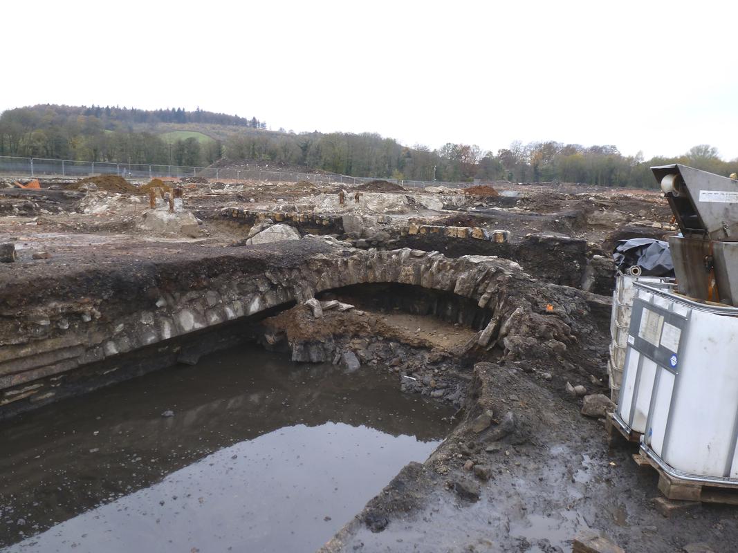 Looking north from northern of pair of mid 20th century boiler mountings along culverted tailrace from tinplate works, at Tydu tinplate works. This later became Castle / Tydy nail works, and later incorperated within Rogerstone Aluminium Works.