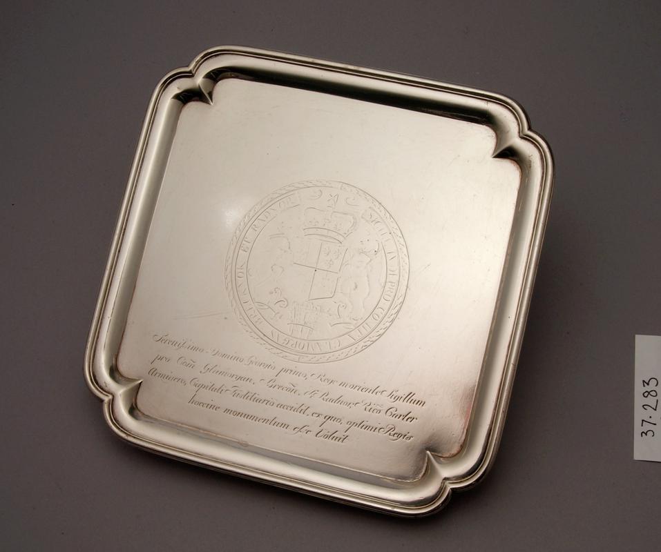 ceremonial trowel; silver blade attached to ivory handle, which has carved decoration of leaves and beads