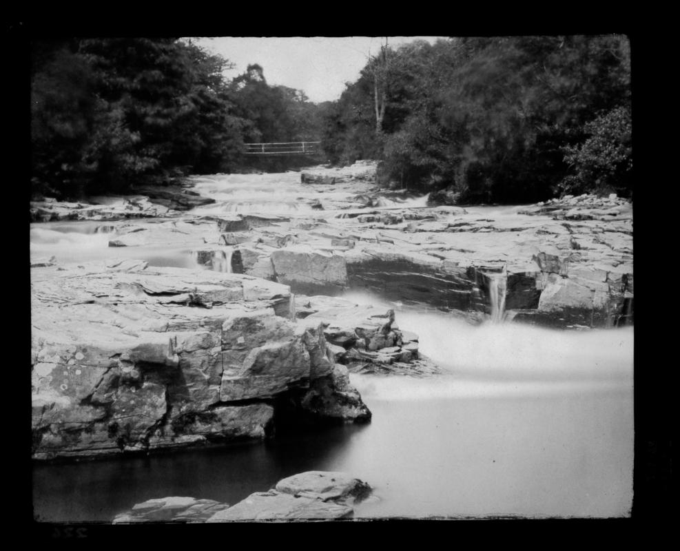 Calotype negative showing the falls on the River Dulais with bridge in background. Tab at each corner.